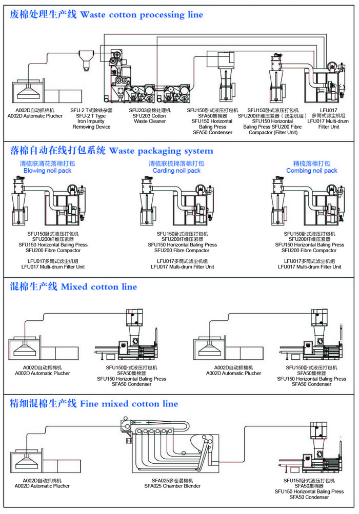 專業(yè)生產SFA系列開清棉設備(包括老機改造)、SFU廢棉處理機系統(tǒng)設備、紡織除塵設備、及粗紗頭開松機、立式臥式液壓打包